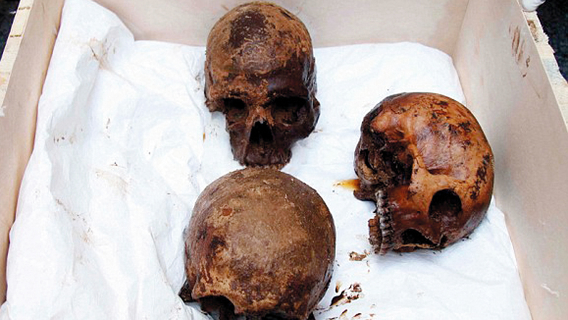 إحدى الجماجم الثلاث تحمل أثراً لضربة سهم حربي في منطقة الجبهة. الإمارات اليوم