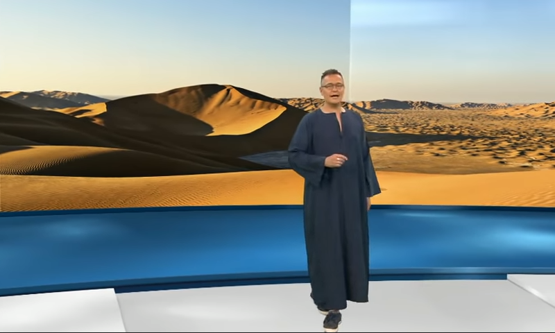 وخاطب المقدم المشاهدين: "قررت أن أتأقلم مع الطقس الصحراوي، حتى تستعدوا لما ينتظرنا في الأيام المقبلة. فالهواء الساخن قادم وهو يشق الآن طريقه لنا عبر الصحراء"، بحسب موقع dw الألماني.