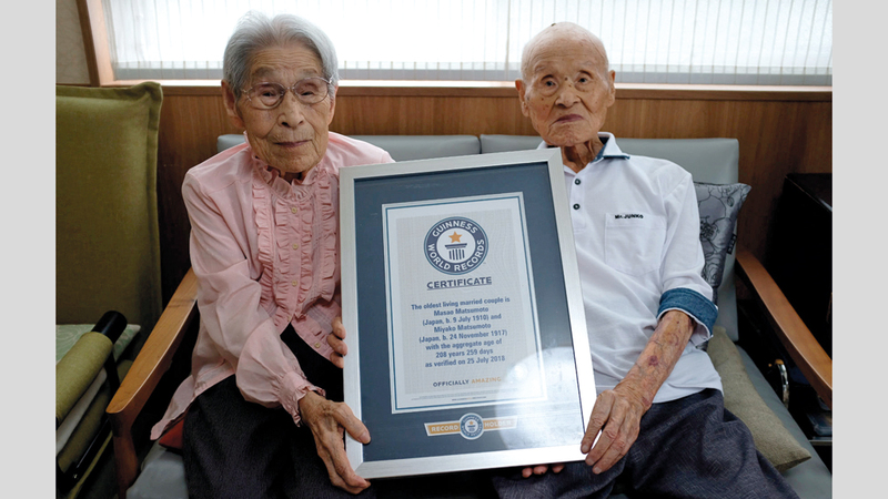 من المعروف عن اليابان أن بها أكبر عدد من المعمرين في العالم، وبوسعها الآن أن تعلن أن بها أكبر زوجين في العالم، إذ يبلغ عمرهما مجتمعين 208 أعوام، وهي ميزة تعزوها الزوجة إلى صبرها على مدى 80 عاماً من الزواج.