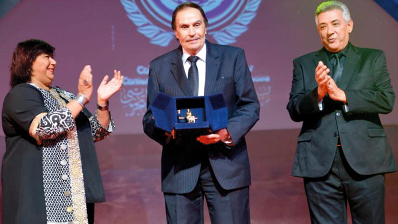 عزت العلايلي يتلقى تكريمه خلال افتتاح المهرجان. من المصدر