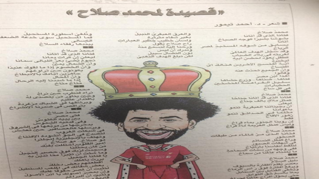 كسرت صحيفة «الأهرام» القاهرية التقاليد المعتادة فنشرت على صفحتها الرياضية قصيدة مديح في لاعب الكرة العالمي محمد صلاح كتبها الشاعر الطبيب أحمد تيمور احتفاء بموهبة صلاح ونجاحاته، وفي حين اعتبر البعض أن كتابة القصيدة، ونشرها في الصحيفة االمصرية الأقرب الى الخط الرسمي والى الروح المحافظة تكريما يستحقه صلاح، هاجم البعض الخطوة اعتبرها البعض الآخر أن الابداع الأدبي دخل على هذا النحو حالة من «الشعبوية»، وان محمد صلاح يمكن أن يكرم في مقال او كتابة رياضية او مانشيت صحافي، لكن ليس مكان تكريمه «قصيدة شعر»..