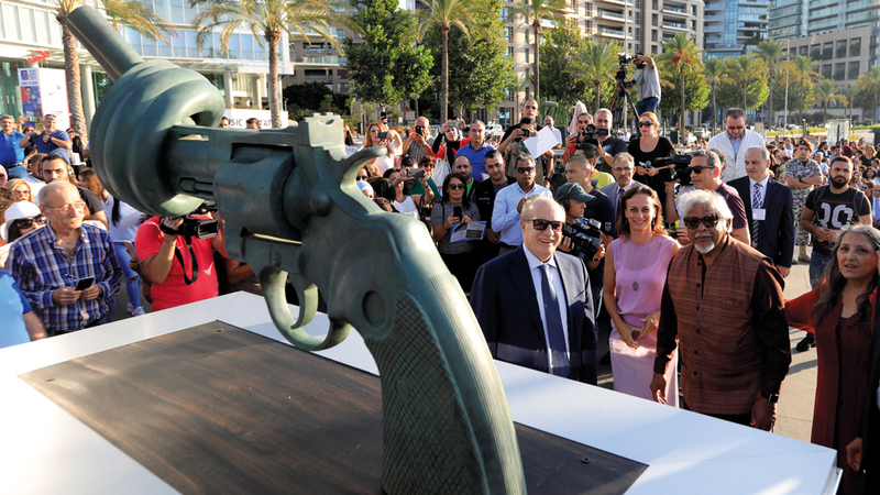 كشفت العاصمة اللبنانية بيروت، أول من أمس، النقاب عن نسخة من تمثال (منحوتة) لمسدّس معقود أصبح رمزاً للسلام، بالقرب من برج تعيد واجهته المدمّرة إلى الأذهان ويلات الحرب الأهلية التي مزّقت المدينة في يوم من الأيام.