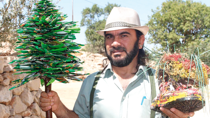 يستخدم الفنان الأردني، البالغ من العمر 53 عاماً، المواد المعاد تدويرها لتشكيل أعمال فنية تعكس تاريخ بيئته الخاصة وثقافتها.