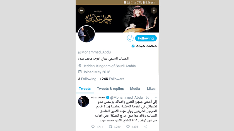 لم تمر بضعة أيام على التغريدة التي نشرها فنان العرب محمد عبده على صفحته الرسمية على «تويتر»، والتمس فيها العذر من جمهوره على انسحابه المؤقت من الساحة الفنية، واعتذاره عن المشاركة في الفرحة الوطنية بزيارة خادم الحرمين الشريفين، الملك سلمان بن عبدالعزيز آل سعود، وولي عهده الأمير محمد بن سلمان آل سعود، للمناطق الشمالية، بسبب الوجود خارج المملكة لتلقي العلاج، حتى انهالت التعليقات المتضامنة مع الفنان، لتتخطى في فترة وجيزة حاجز الـ1711 ألف تعليقاً، أجمع معظمها على الدعوة الخالصة للفنان بدوام الصحة والعافية، في الوقت الذي توحدت فيه أصوات عشاق الفنان وجمهوره ومتابعيه داخل المملكة وخارجها، على التعبير عن خوفهم على صحة الفنان، وتمنياتهم له بالشفاء العاجل، عبر نشر مقاطع من أغنية الفنان الشهيرة «لا باس يالمحبوب»، وأغنية «يالله غني في رجاك»، أو التعليق بالقول «ألف سلامة يا قمة وقيمة الفن العربي»، في لفتة كريمة للفنان، واعتراف بقيمته ومكانته الأثيرة في قلوبهم، فيما نزع فريق كبير من محبي فنان العرب، فور تلقيهم خبر مرضه، إلى الاستفاضة في الإعراب عن حبهم الكبير له ولفنه، عبر تعليقات مفادها «فيني ولا فييييك يا حبيب روحي، انت بعمري عنك والله بعمري بروحي عنك، ألف لاباس عليك يا عشقي، الله يشفيك ويعافيك ويقومك بسلامة لنا ويحميك ويحفظك ويخليك لنا ولعيالك، ألف لا باس عليك»، و«ألف سلامة عليك مطربنا الغالي، أدام الله عليك الصحة والعافية ولا حرمنا الله من صوتك أبدا يا صاحب الفن والأداء الراقي». في المقابل، عبّر شق كبير آخر عن قلقهم على صحة الفنان، وتساؤلاتهم عن طبيعة المرض الذي أصابه، لكن فنان العرب اختار التزام الصمت، ولم يبادر بالرد على أي من تساؤلات جمهوره الكثيرة، ولا كشف أية تفاصيل متعلقة بوضعه الصحي وطبيعة مرضه.