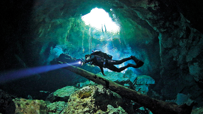 يُعرف كهف «سينوت إسكيليتو» بمعبد الموت، وهو من أشهر وأخطر كهوف الغوص في أميركا الوسطى، ويقع الكهف أسفل أطلال مدينة «تولوم» بالمكسيك، ويتكون من ممرات مائية ومغارات متشابكة عدة. أما الطريقة الوحيدة لدخول الكهف فهي القفز في مدخله مباشرة، وتكمن الخطورة في ضياع الغواصين في ممراته المليئة بالتشعبات، ونفاد مخزونهم من الأكسجين.
