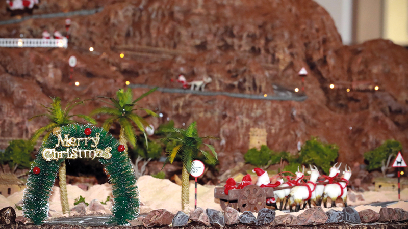 واستغرق صنع المجسّم، الذي تزدان به ردهة منتجع وسبا هيلتون رأس الخيمة حتى نهاية العام الجاري، شهراً كاملاً، وشارك فيه 15 شخصاً من طاقم الفريق الذي استوحى الفكرة من رحلة إلى جبال رأس الخيمة.