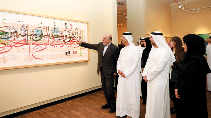 العويس يستمع إلى شرح من أحمد مصطفى حول إحدى لوحات «المعرض». من المصدر