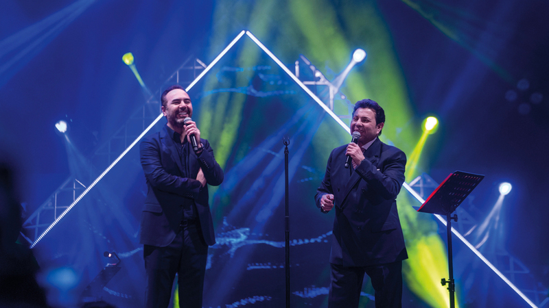في أولى حفلات مسرح المجاز بالشارقة للموسم الحالي، أحيا الفنانان هاني شاكر ووائل جسار، أول من أمس، حفلاً فنياً تنوّع بين أحدث أغانيهما وألبومات الماضي شكَّلت مسيرتهما الفنية.