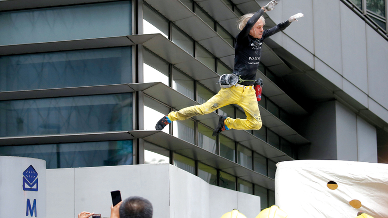 وشوهد الرجل (56 عاماً)، المعروف بتسلق المباني الشاهقة في العالم، وهو يتدلى من فوق برج «جي. تي»، في ماكاتي سيتي، الحي المالي بمانيلا.