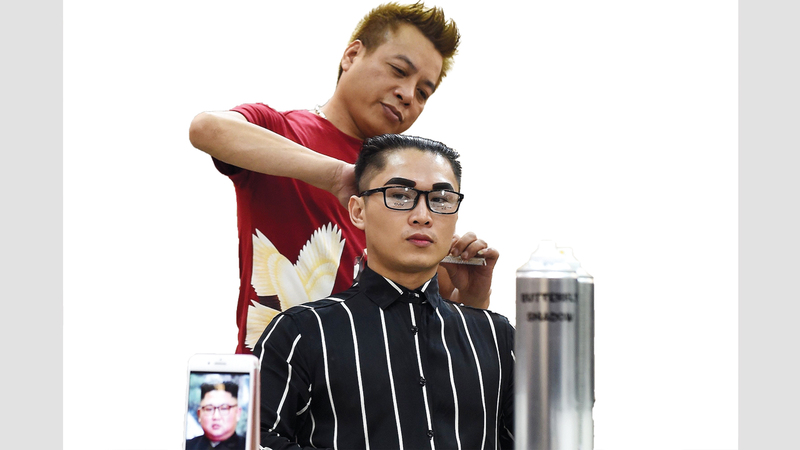 دوونغ يصفف أحد زبائنه على غرار كيم. أ.ف.ب