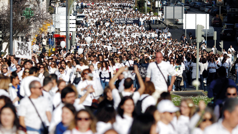 نزل آلاف الممرضين والممرضات بزيهم الأبيض إلى شوارع لشبونة، حاملين زهوراً بيضاء للمطالبة بزيادة الأجور، وتحسين أوضاع العمل، وللاحتجاج على تعامل الحكومة البرتغالية السيّئ مع الخلاف المستمر منذ فترة طويلة.