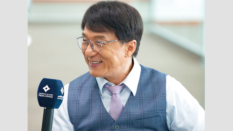 جاكي شان خلال لقاء إعلامي نظمته لجنة دبي للإنتاج التلفزيوني والسينمائي. من المصدر