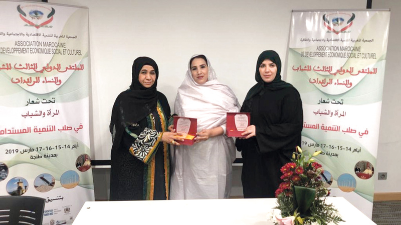 وتسلمت الفائزتان درع الجائزة في الحفل الختامي للملتقى الدولي الثالث للشباب والنساء الرائدات الذي أُقيم، أخيراً، في مدينة طنجة بالمملكة المغربية تحت شعار «المرأة والشباب في صلب التنمية المستدامة».