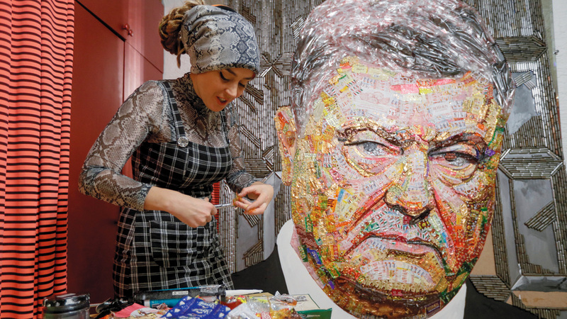 بينما تستعد أوكرانيا لإجراء الانتخابات الرئاسية غداً، صنع فنان وفنانة لوحة تنطوي على انتقاد للرئيس الحالي، بترو بوروشينكو، مستخدمين أغلفة الحلوى وفوارغ الطلقات.