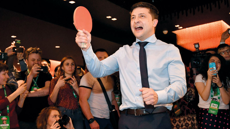 تميز زلينسكي المشهور بتأدية دور رئيس خيالي في برنامج تلفزيوني شعبي اسمه «خادم الشعب». رويترز