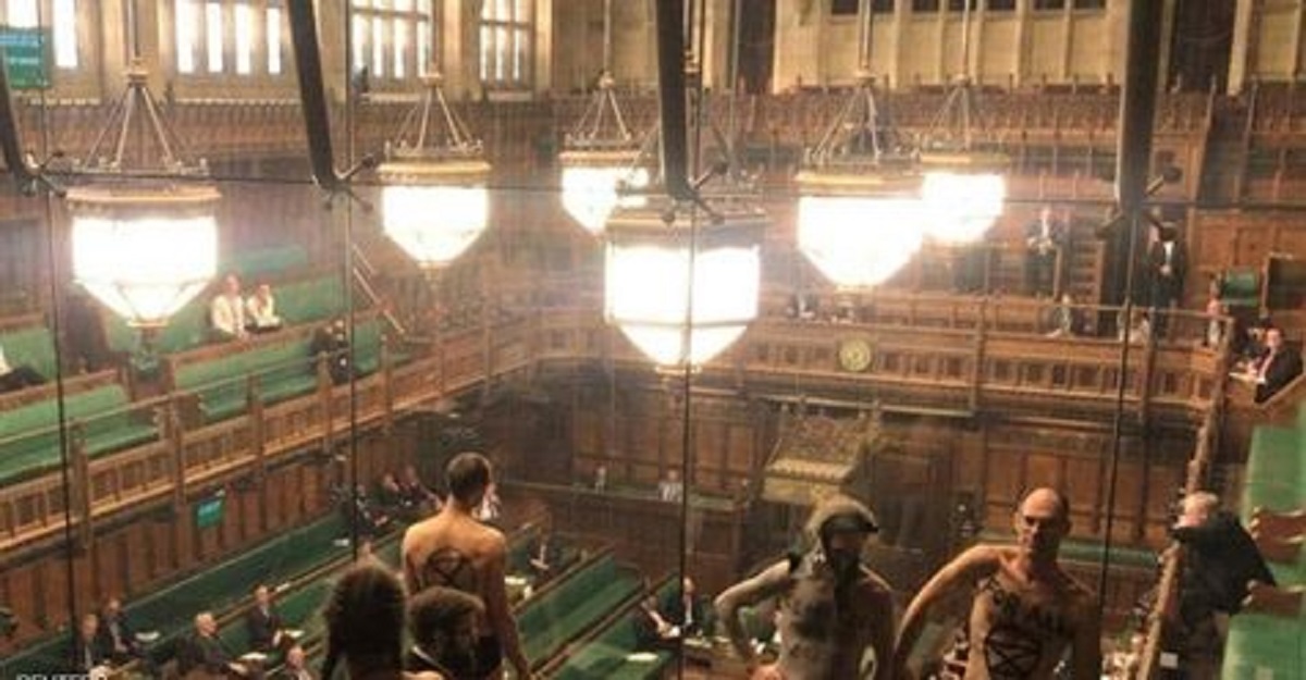 اقتحم ناشطون عراة البرلمان البريطاني خلال جلسة رسمية له لمناقشة مجلس العموم المتعلقة بآليات الخروج من الاتحاد الأوروبي "البريكست". احتجاجا على "التغير المناخي"، قبل أن تعتقل الشرطة 12 محتجاً منهم لاحقاً، بحسب ما نقلت صحيفة "غارديان" البريطانية.