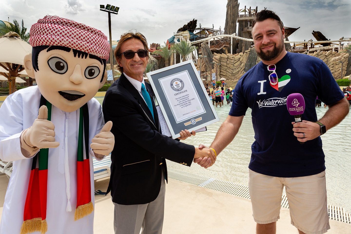 نجحت مدينة الألعاب المائية ياس ووتروورلد، بأبوظبي، في تسجيل رقم قياسي جديد بموسوعة غينيس للأرقام القياسية، بأكبر عدد من الجنسيات في حوض سباحة، على هامش الفعالية التي نظمتها المدينة مؤخراً احتفاءً بعام التسامح.