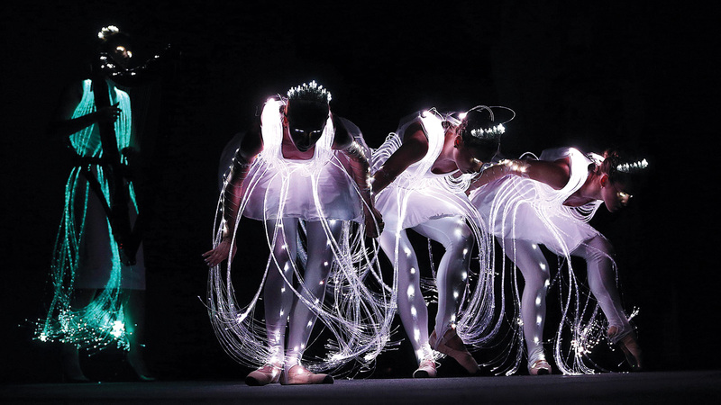 بملابسهم المضيئة، وعلى أنغام الموسيقى المفعمة بالحياة، التي انتشرت بين ردهات مسرح المهرجان، قدمت فرقة الباليرينا الموسيقية من أوكرانيا، عرضاً فنياً بعنوان «استعراضات مضيئة»، الذي سافر بالزوّار إلى عوالم الإبداع والخيال. وجسّد العرض أحد أهم الفنون التعبيرية، وهو فن «الباليه»، الذي قدمته الفرقة بصورته الراقية، حيث تتمايل حركات الراقصات الثلاث في تناغم استثنائي ودقيق بين الإيماءة والنغمة الموسيقية، لينقل الحضور بين مشاعر مملوءة بالحب والبهجة تارة، وبين عوالم تلامس أحاسيسهم وتدق على أبواب قلوبهم تارة أخرى، والتي تتوافق مع حركة الراقصات اللائي يتمتعن بخفة ورشاقة ومرونة فريدة.