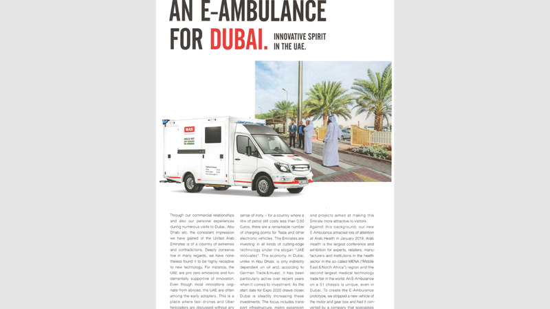نشرت مجلة «واس» الألمانية في عددها الأخير تحقيقاً مصوراً عن مؤسسة دبي لخدمات الإسعاف، عرضت فيه الآليات الحديثة والمركبات المتطوّرة التي تحوزها، منها أكبر حافلة إسعاف في العالم