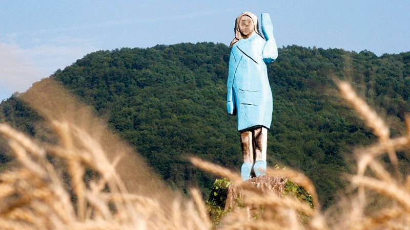 جرى الكشف عن تمثال خشبي بالحجم الطبيعي لسيدة الولايات المتحدة الأولى، ميلانيا ترامب، قرب مسقط رأسها سيفنيكا بجنوب شرق سلوفينيا. ونحت التمثال الفنان المحلي أليس زوبيفتس، بتكليف من الفنان الأميركي المقيم في برلين براد داوني. وتزامن الكشف عن التمثال، الذي ربما يكون ساخراً، مع معرض لداوني في يوبليانا عاصمة سلوفينيا، عن جذور ميلانيا في هذا البلد الصغير.