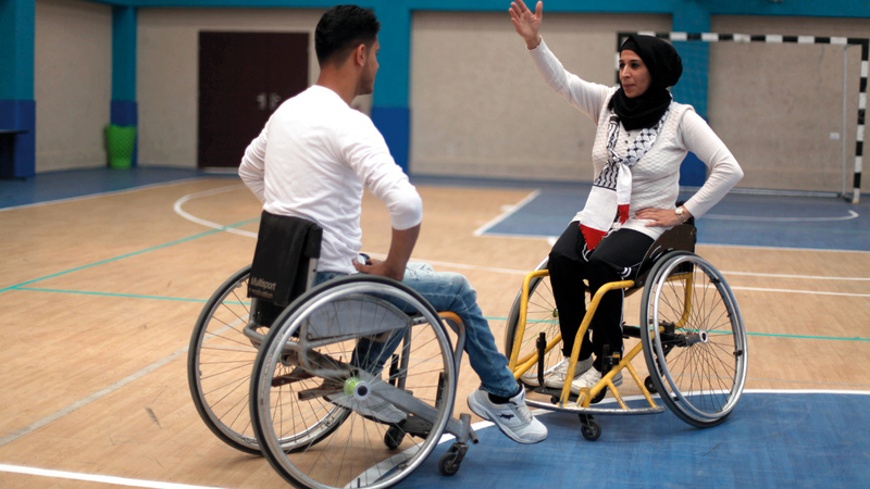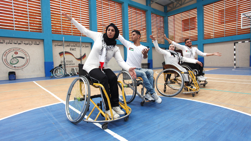 فداخل صالة رياضية في نادي السلام الرياضي تجتمع الفتاتان عبير ورئيسة برفقة الشباب الثلاثة نور وعلي وحسام بشكل يومي، وعلى أنغام أغاني «على العين موليتي»، و«على دلعونا» التراثية يدبكون من فوق كراسيهم المتحركة، إذ يدفعونها بأجسادهم، فيما يلوحون بأيديهم، في خطوة لتحقيق طموحاتهم وتغيير واقعهم الأليم، إلى جانب الحفاظ على هوية ذلك الفن الشعبي كجزء من تراث وطنهم.