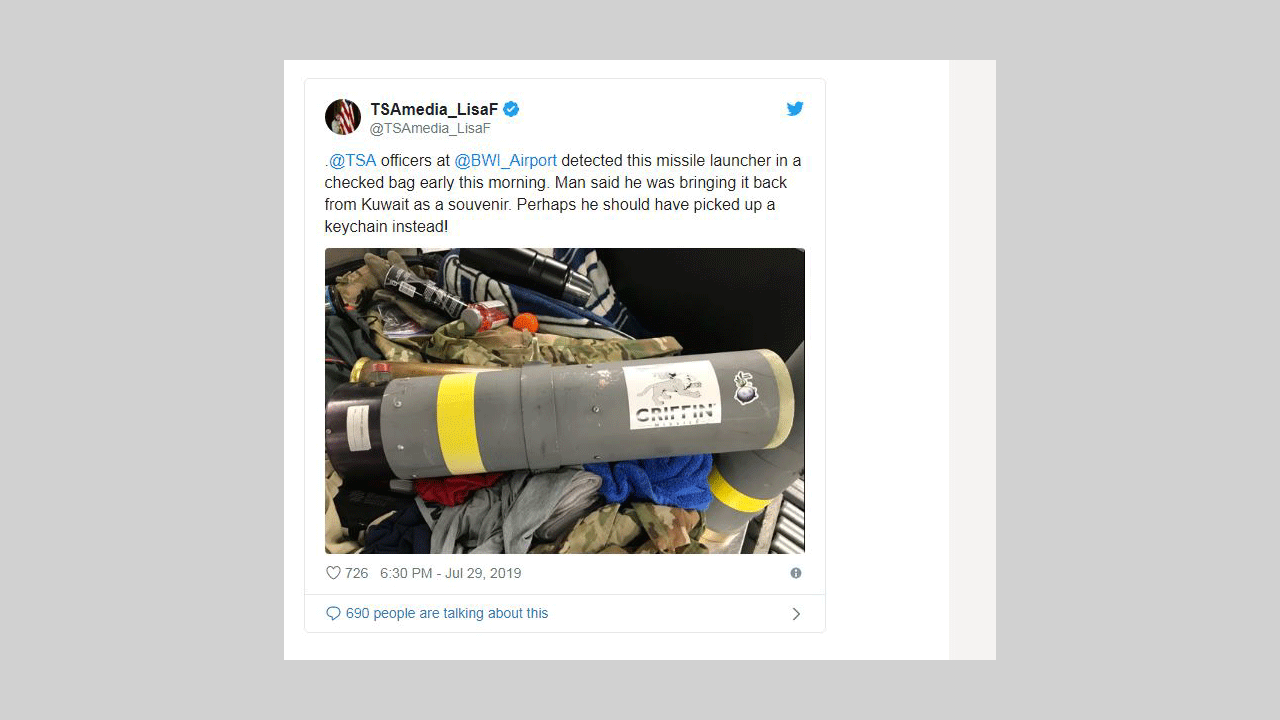 ونقلت وكالة الأنباء الفرنسية عن المسافر أنه أحضر قاذفة الصواريخ كـ "هدية تذكارية" من الكويت، فيما كتبت ليزا فاربستاين، المتحدثة باسم وكالة سلامة النقل الأميركية على "تويتر": "ربما كان من الأفضل له جلب ميدالية مفاتيح وحسب بدلاً عن قاذفة الصواريخ تلك".