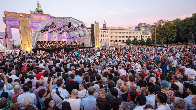 عزف أوركسترا برلين السيمفوني تحت قيادة مديره الجديد كيريل بيترينكو مساء أول من أمس، السيمفونية التاسعة لبيتهوفن أمام بوابة براندنبورغ الشهيرة في العاصمة الألمانية.