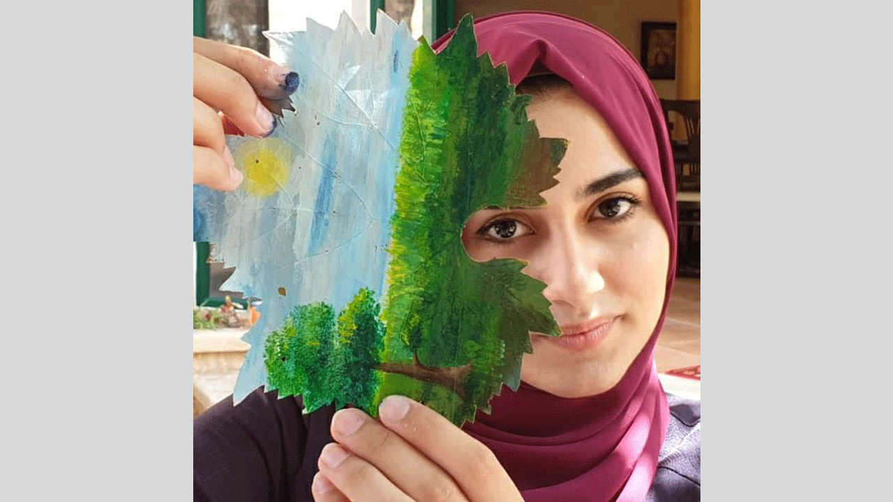 وتستخدم لين الحاج (21 عاماً) ورق العنف المجفف كقماش ترسم عليه لوحاتها الفنية.