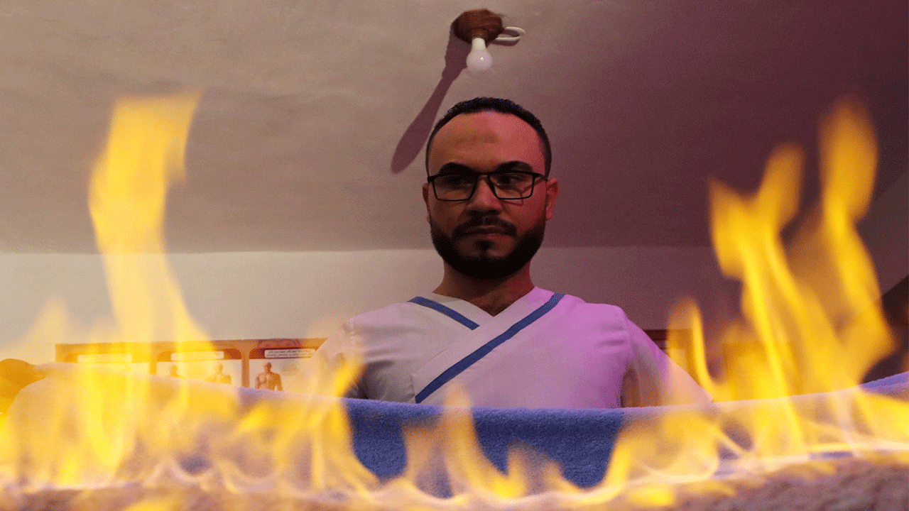 يستخدم مُدلك مصري النار لتخفيف ألم عضلات روّاد مركزه للاستجمام في محافظة الغربية بدلتا النيل.