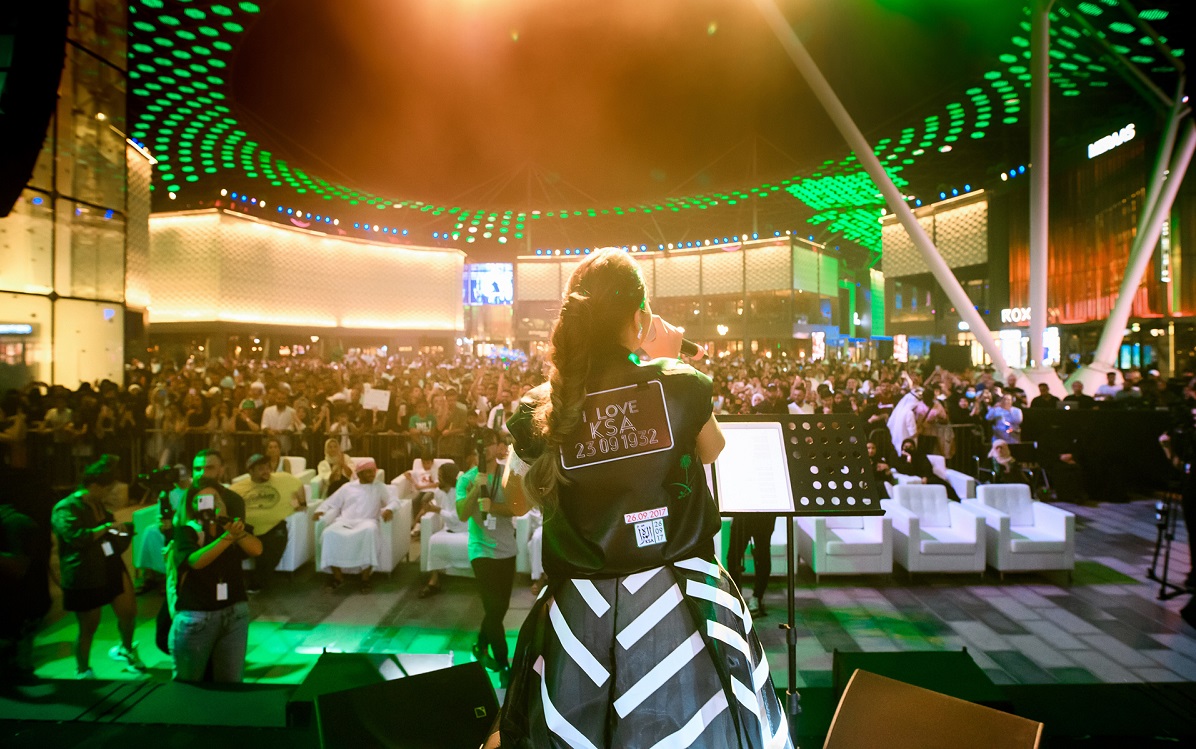 بثوب مزيّن بشعار المملكة، وحروف I love KSA، أحيت الفنانة بلقيس فتحي حفلاً فنياً، استضافته وجهة «سيتي ووك» في دبي، احتفالاً باليوم الوطني الـ89 للمملكة العربية السعودية.