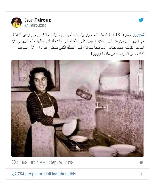 تداول رواد مواقع التواصل الإجتماعي صورة نادرة للراحلة فيروز، وبحسب صفحة "فيروز" غير الرسمية على موقع تويتر فإن هذه الصورة التقطت لها حين "كان عمرها 18 عاماً وهي تغسل الصحون وتحدث أمها في منزل العائلة في حي زقاق البلاط ببيروت.