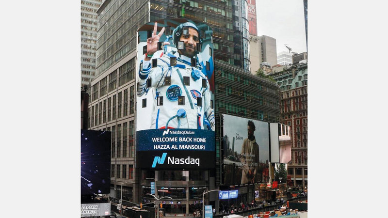 وقال المكتب الإعلامي لحكومة دبي، في تغريدة على «تويتر»، معلقاً على الصورة: «(ناسداك دبي) تنقل احتفالات الإمارات بمناسبة عودة رائد الفضاء الإماراتي، هزاع المنصوري، لأرض الوطن، إلى ساحة تايمز سكوير في نيويورك».