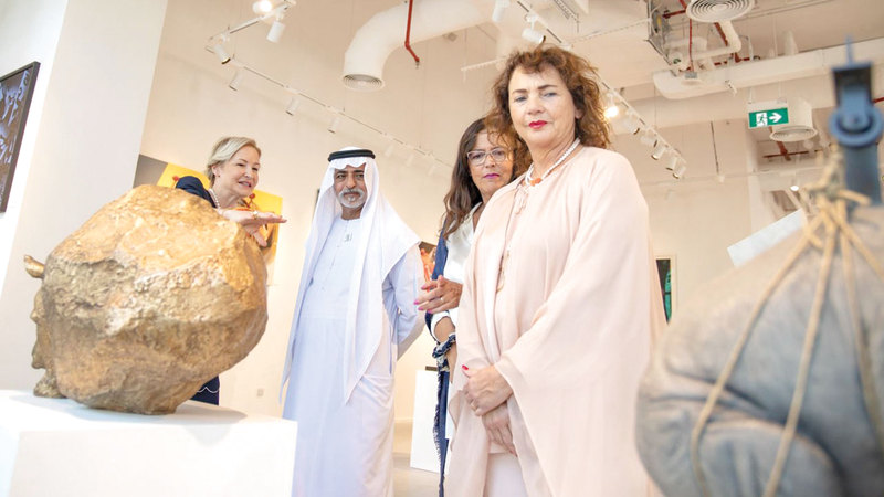 نهيان بن مبارك يستمع لشرح حول الأعمال خلال افتتاح المعرض. من المصدر