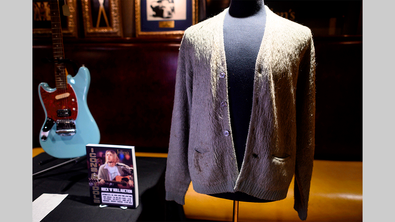 بيعت سترة صوفية «كارديجان» لونها أخضر زيتوني ارتداها الموسيقي الأميركي كيرت كوبين عضو فرقة نيرفانا لموسيقى الروك، والتي ارتداها خلال أداء عرض «إم تي في أنبلجد» الشهير للفرقة في عام 1993، في مزاد علني أول من أمس بمبلغ قياسي بلغ 334 ألف دولار.