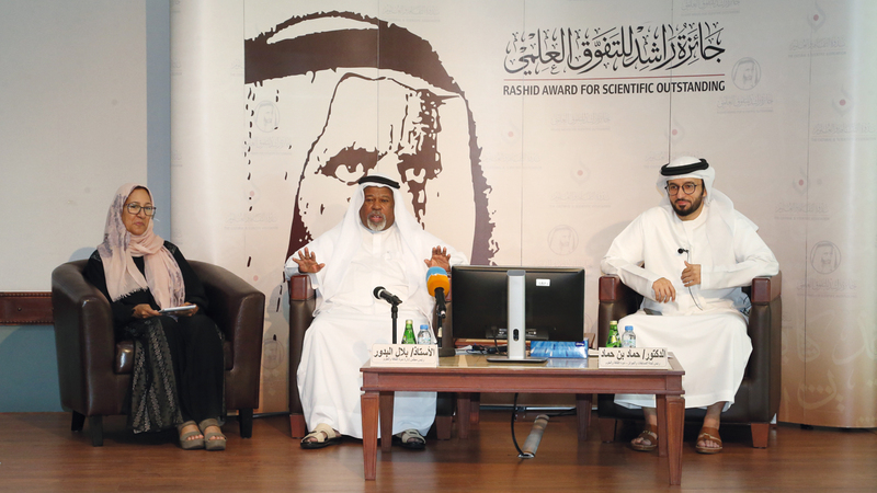 البدور يتوسط نجاة مكي وبن حماد خلال المؤتمر. من المصدر