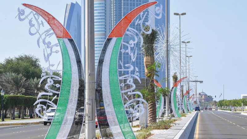 كما تتزين العاصمة بعبارات ترسّخ قيم الوطنية والانتماء والولاء للقيادة الحكيمة، وتعلي من معاني اليوم المجيد، الذي وحّد شعب الإمارات، وأرسى أنجح تجربة وحدوية في العالم العربي.