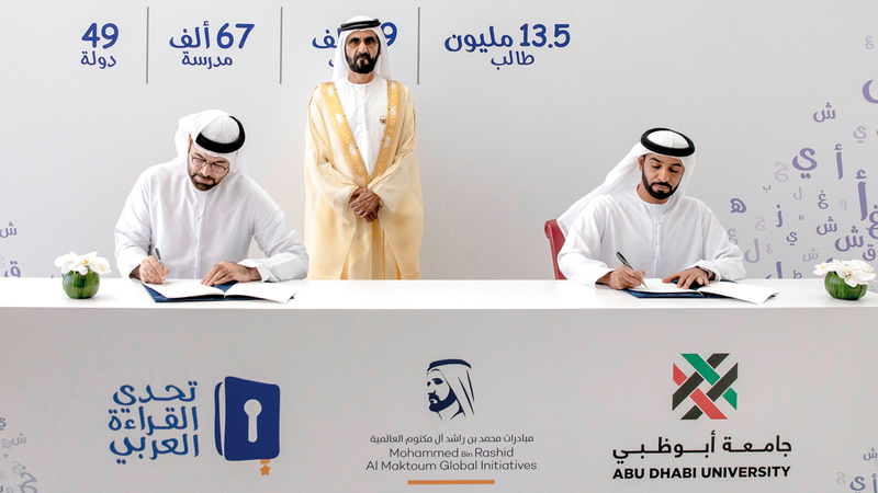شهد صاحب السموّ الشيخ محمد بن راشد آل مكتوم، نائب رئيس الدولة رئيس مجلس الوزراء حاكم دبي، توقيع اتفاقية تعاون بين جامعة أبوظبي، ومبادرات محمد بن راشد آل مكتوم العالمية، بحيث تصبح جامعة أبوظبي بموجبها شريكاً استراتيجياً لمبادرة «تحدي القراءة العربي»، المنضوية تحت مظلة المبادرات.