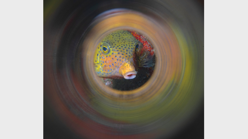 للمصور رسالة وهو يتجوّل بين آيات الله عز وجل في أعماق بحرٍ يعجّ بالجمال والتنوع متزيناً باللؤلؤ والمرجان، وهي رسالة تنبّه الإنسان إلى أهمية المحافظة على هذا الغنى البيئي تحت الماء، الذي يعد مظهراً مقابلاً للثراء الذي تتمتّع به الطبيعة البرية، الأمر يتعلّق بمهمة نبيلة تتمثّل في المحافظة على البيئة في البر والبحر، وتصبح لأيدي البشر مبادرات طيبة، تنبع من روحٍ تقدّر أهمية الحياة الطبيعية خير تقدير.. صورة للسمكة الصندوق التقطتها بخاصية الأنبوب الذي يضفي صفة فنية خاصة للقطة. والصورة من إمارة الفجيرة بدولتنا الحبيبة.
