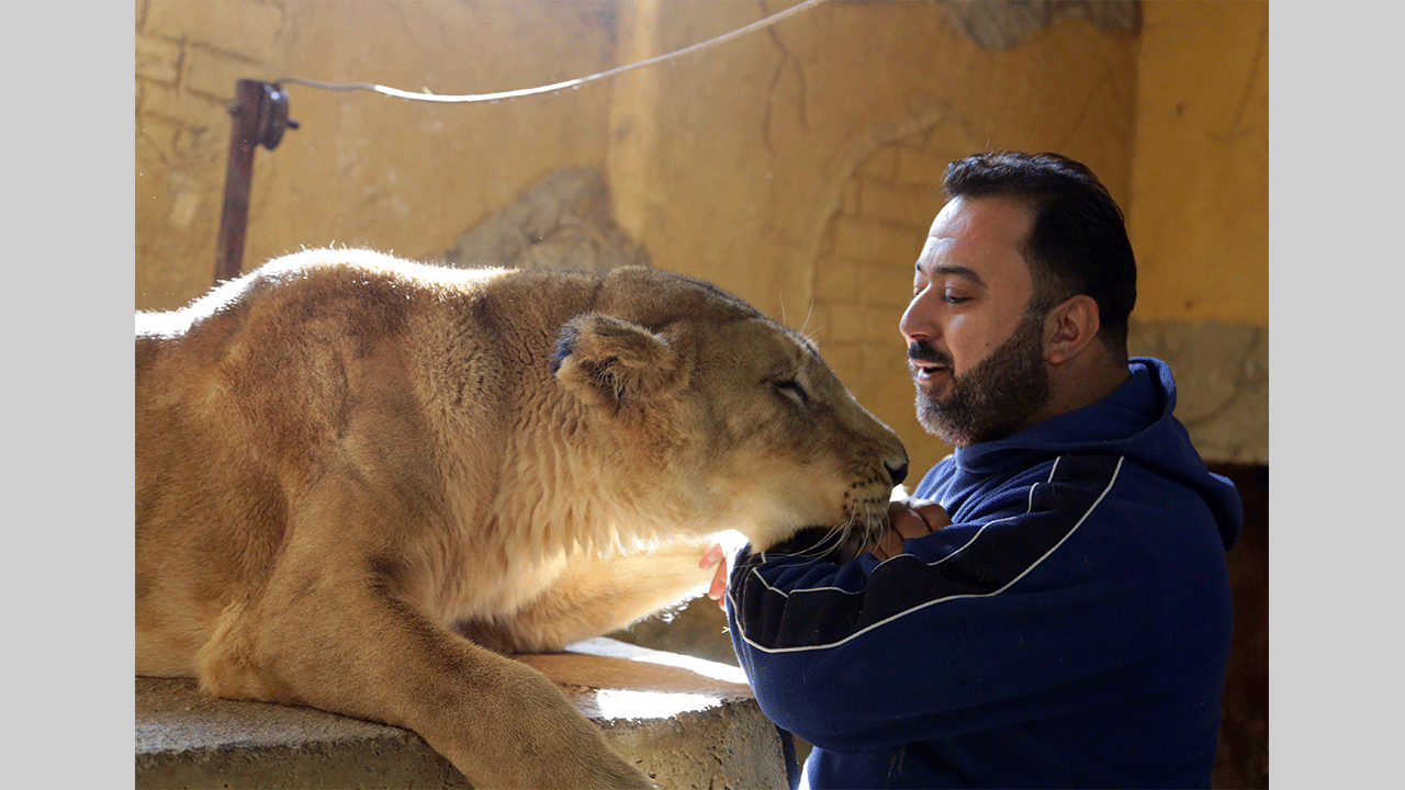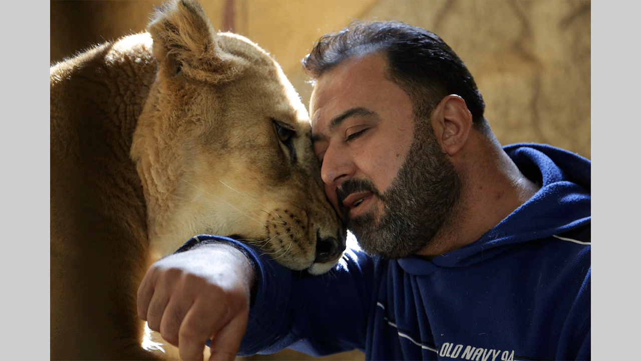 سمير الحمصي، سوري يقضي يومه وهو يلاطف أسوداً محببة لقلبه أو يداعب نموراً أو حيوانات مفترسة أخرى، وكأنها حيوانات أليفة، في مأوى صغير خاص به للحيوانات في ريف دمشق.