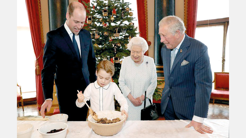 ونشر قصر باكنغهام، أمس، صوراً للملكة والأمراء الثلاثة الذين يخلفونها بالترتيب في ولاية العرش، أثناء تحضيرهم لحلوى (البودينج) التي ترتبط بعيد الميلاد.