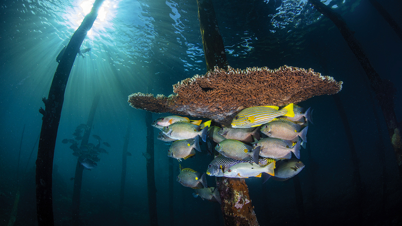 من الصّعب تطبيق المعايير الاعتيادية عند دراسة سلوك النّوم لدى الأسماك، فهي لا تمتلك هياكل دماغ معقدة يمكن قياس التغيّر في نشاطها الكهربائي عند النّوم، ولا تمتلك أجفاناً يمكن غلقها. تشير الأبحاث إلى أن الأسماك تشهد حالة من فقدان الوعي (Suspended animation)، تشبه نوعاً ما النّوم عند البشر، وتبقى في حالة تأهّب للمخاطر التي تحيط بها، بعضها يكون طافياً، والبعض منها يلجأ إلى الاختباء في الطّين أو الشِّعاب المرجانية.. صورة التقطتها لمجموعة من الأسماك تحتمي تحت المرجان في إحدى أجمل مناطق العالم للتصوير تحت الماء بإندونيسيا، من منطقة راجا امبات.