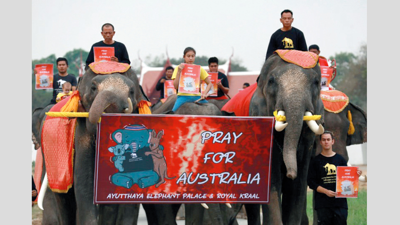 وحملت الفيلة وحراسها لافتات عليها صور ورسومات للحيوانات، وعبارات تقول «صلوا من أجل أستراليا»، خلال الحدث الذي نظمه متنزه أيوتهايا إليفانت بالاس أند رويال كرال، وهو مقصد سياحي محلي.