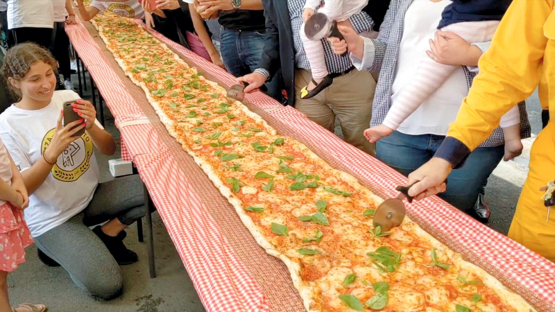 أعد المطعم في البداية قطعاً مستطيلة من عجين البيتزا بطول متر ثم جمعها معاً،