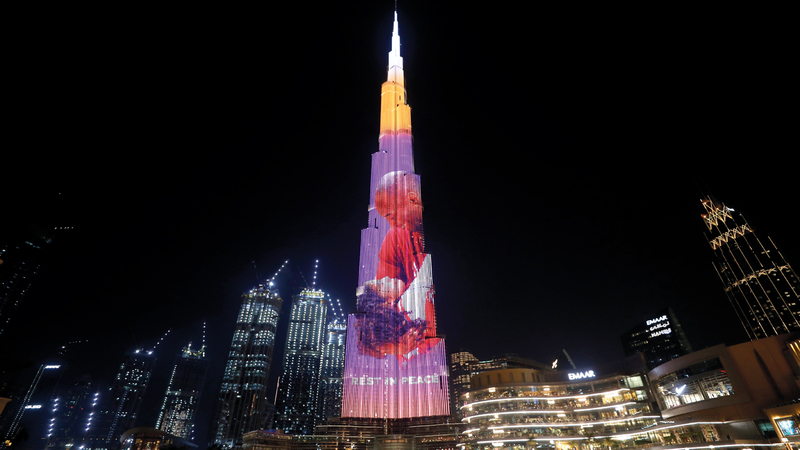 صورة أسطورة كرة السلة الأميركية كوبي براينت، وابنته جيانا، اللذين رحلا أخيراً، في حادث تحطم طائرة مروحية، على واجهة أطول مبنى في العالم، برج خليفة في دبي، في لفتة تأبينية من رجل الأعمال الإماراتي، أحمد بن سليم، الذي سبق أن استضاف براينت بدبي، في شهر سبتمبر عام 2013، خلال زيارته الأولى للدولة.