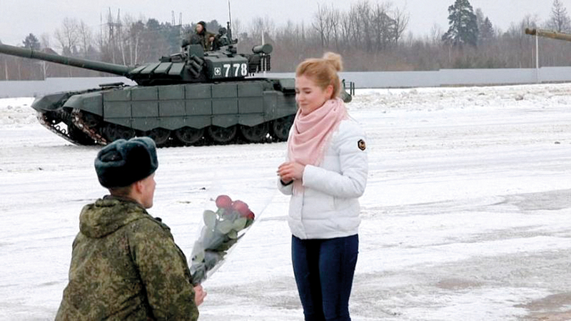 ضابط روسي يطلب يد حبيبته محاطاً بدبابات
