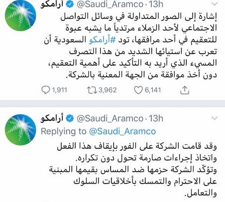 وعبرت أرامكو، في بيان نشرته عبر صفحتها على تويتر، عن استيائها الشديد من التصرف المسيء الذي أريد به التأكيد على أهمية التعقيم، دون أخذ موافقة من الجهة المعنية بالشركة".