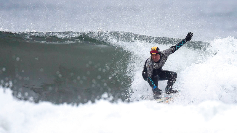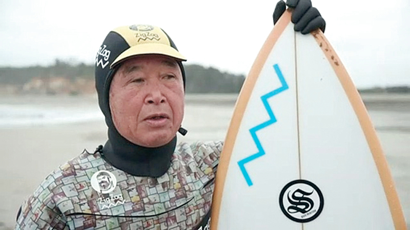 يحمل كوجي سوزوكي (64 عاماً)، لوح ركوب الأمواج صباح كل يوم، سواء أكان الطقس مشمساً أو ماطراً، ليمارس رياضته المفضلة على أحد شواطئ فوكوشيما، التي تعدّ من الأجمل في اليابان.