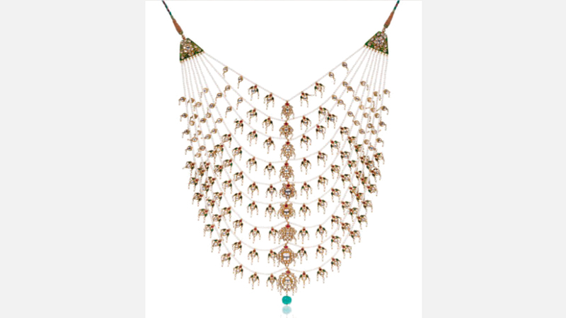 يتألف من تسعة صفوف من اللؤلؤ، كل منها معلق بدقة بقلادات مرصعة بمجموعة من الأحجار الكريمة، لتصل ذروتها في حبة زمرد منحوتة، وقد صنعت هذه القلادة في الهند، كما يطالب نبلاء أوروبا بأحدث صيحات الموضة عبر الثقافات، وله مثال مشابه كانت ترتديه المطربة المصرية الشهيرة أم كلثوم، وتم عرضه أخيراً في متحف اللوفر أبوظبي. وتعد هذه القطعة جزءاً من مجموعة أوسع كانت ذات مرة في حوزة أميرة هندية.