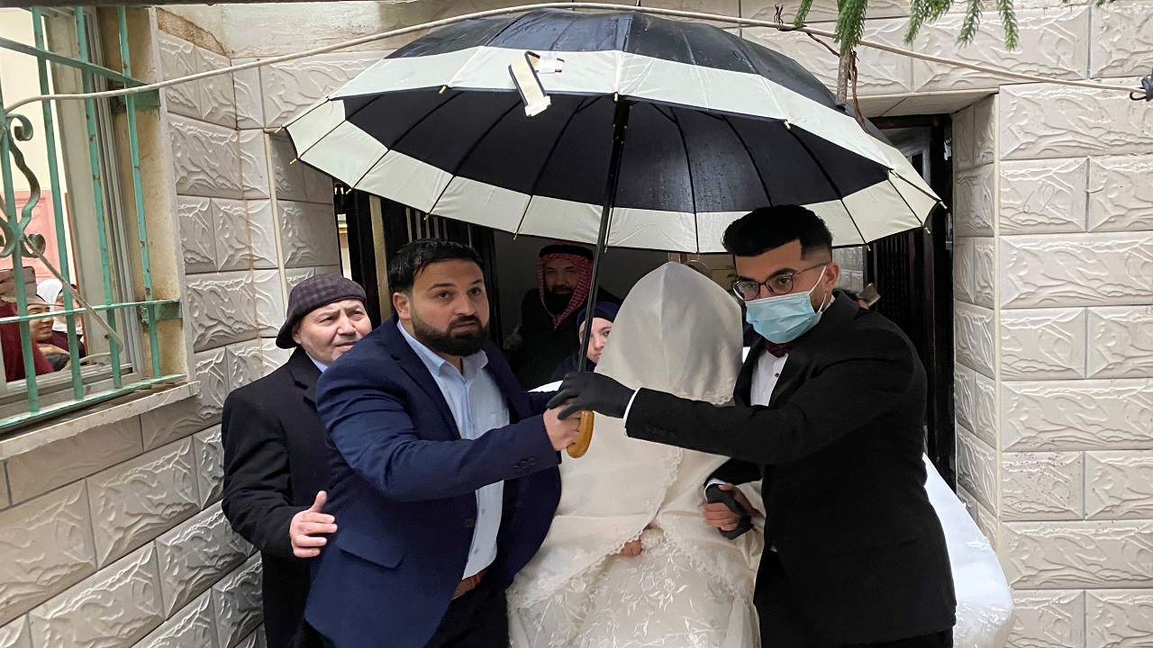 وانتقل العروسان إلى قاعة زفاف شبه خالية، واضطرا إلى المرور عبر نقاط تفتيش مختلفة تحت أمطار غزيرة.