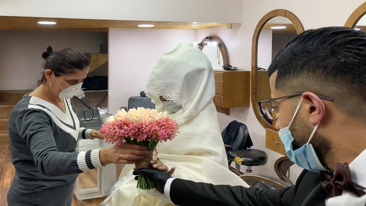 وفي مشهد غير مألوف ارتدت العروس ثوبها الأبيض مع كمامة وقفاز حماية من فيروس كورونا بلون الفستان. ووضع العريس مثلها وإن كان قفازه بلون حُلته.